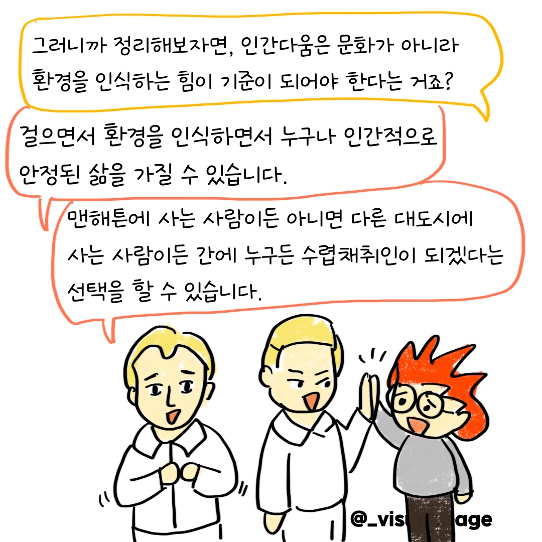이 작가의 말을 들은 인류학자는 그래서 현대인들은 인간다움을 잃어버렸다고 주장합니다. 고대의 수렵채취인들은 자연과 함께 생활하면서 주변 환경과 연대감을 갖고 충분한 지식을 가지면서 살아가는 모습으로 인간다움을 유지했다고 말합니다.