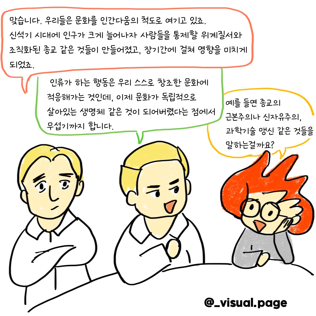 인간다움이란 무엇일까요? 자연과 가까이 사는 모습일까요? 아니면 신석기 시대 이후로 인류가 만들어낸 관습과 문화를 따르며 사는 게 인간다운 것일까요? 작가와 인류학자는 문화의 속성에 대해 주목합니다. 문화는 인류가 만들어낸 것인데, 지금 문화는 사람들의 손을 떠나 생명을 갖기 시작했다며 위험성을 경고합니다. 도덕과 관습, 종교, 이념, 등 문화가 인간다움의 척도여야 할까요?