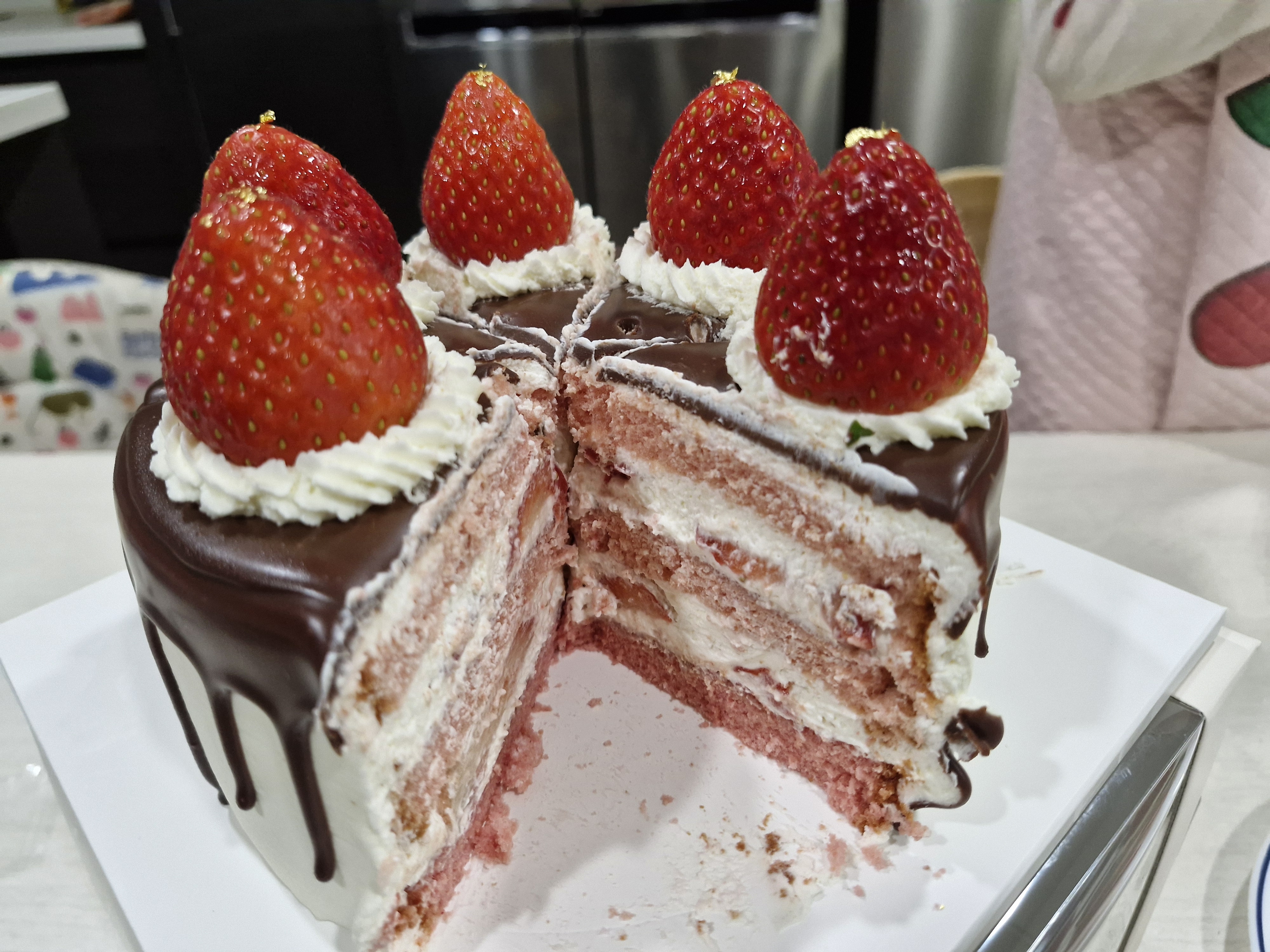 바로 케이크시트가 핑크색이라는 거예요! 보통땐 카스테라 빵 색인데요, 크리스마스 케이크라서 그런지 빨강색소를 써서 특별해졌어요. 사실, 이렇게 조각을 내기 전까지는 장식 외에는 별 게 없어서 평소보다 비싼 값 내고 먹기 돈 아깝다는 생각이 들었는데요, 핑크색 속을 보니 기분이 좋아졌어요!