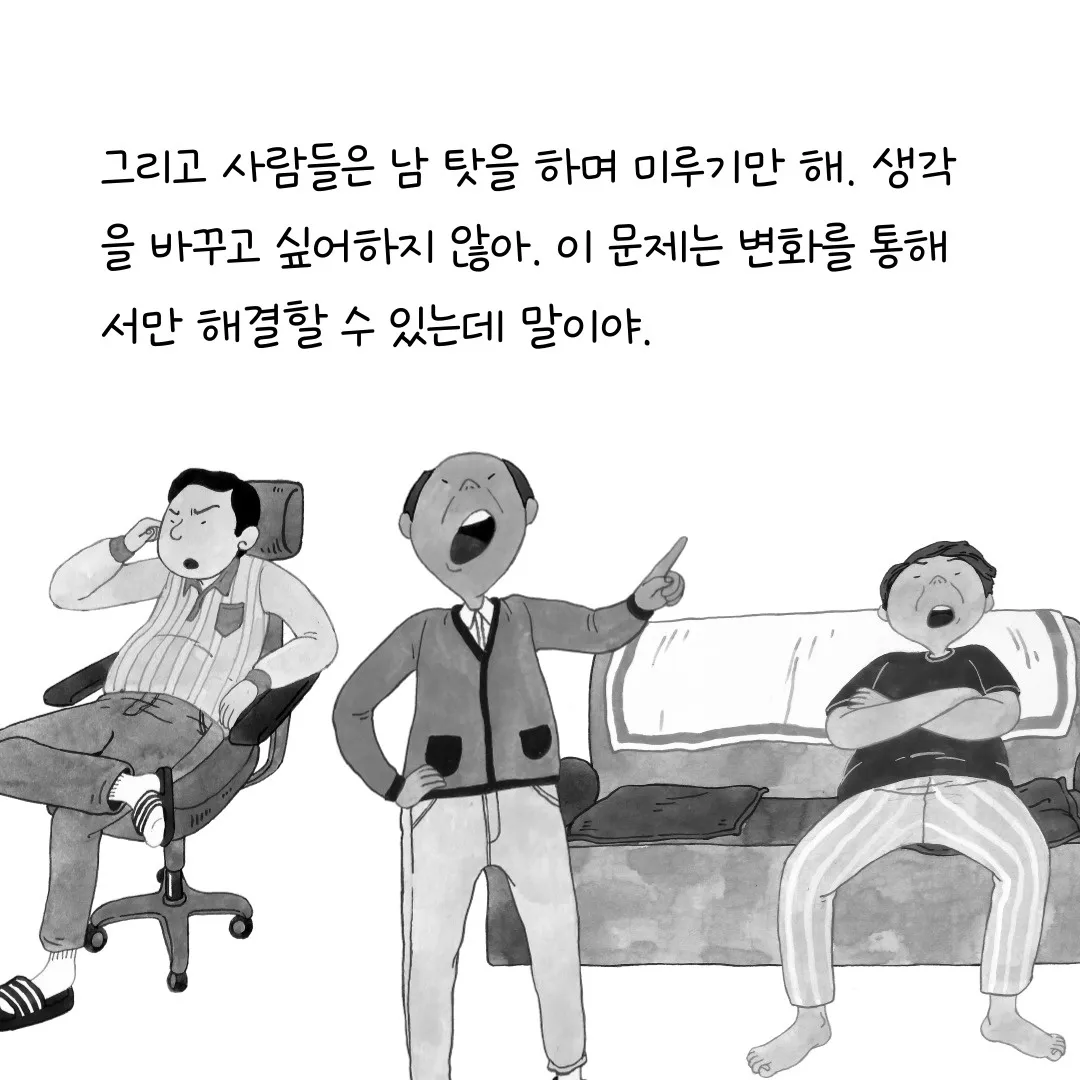 "저는 하이브리드 차를 타는데요, 몇 년째 이 차를 운행하면서 이곳저곳 다녀도 아무런 문제가 없었고, 남들 보기에도 나쁘지 않은 것 같습니다. 우리가 빨리 시작해야 할 일은 사람들의 생각을 바꾸는 것입니다." 131쪽